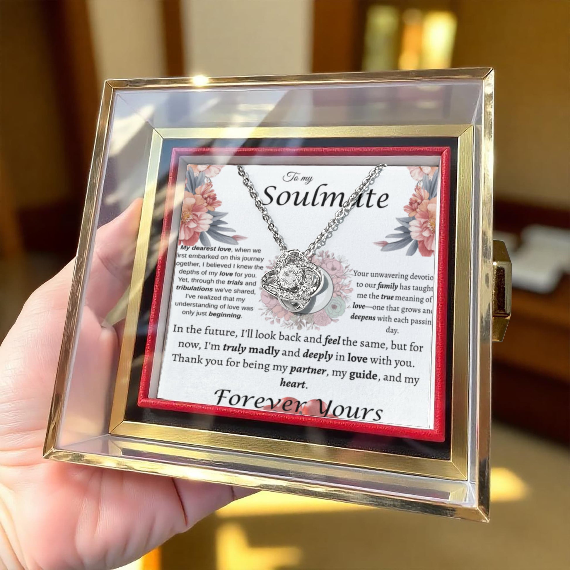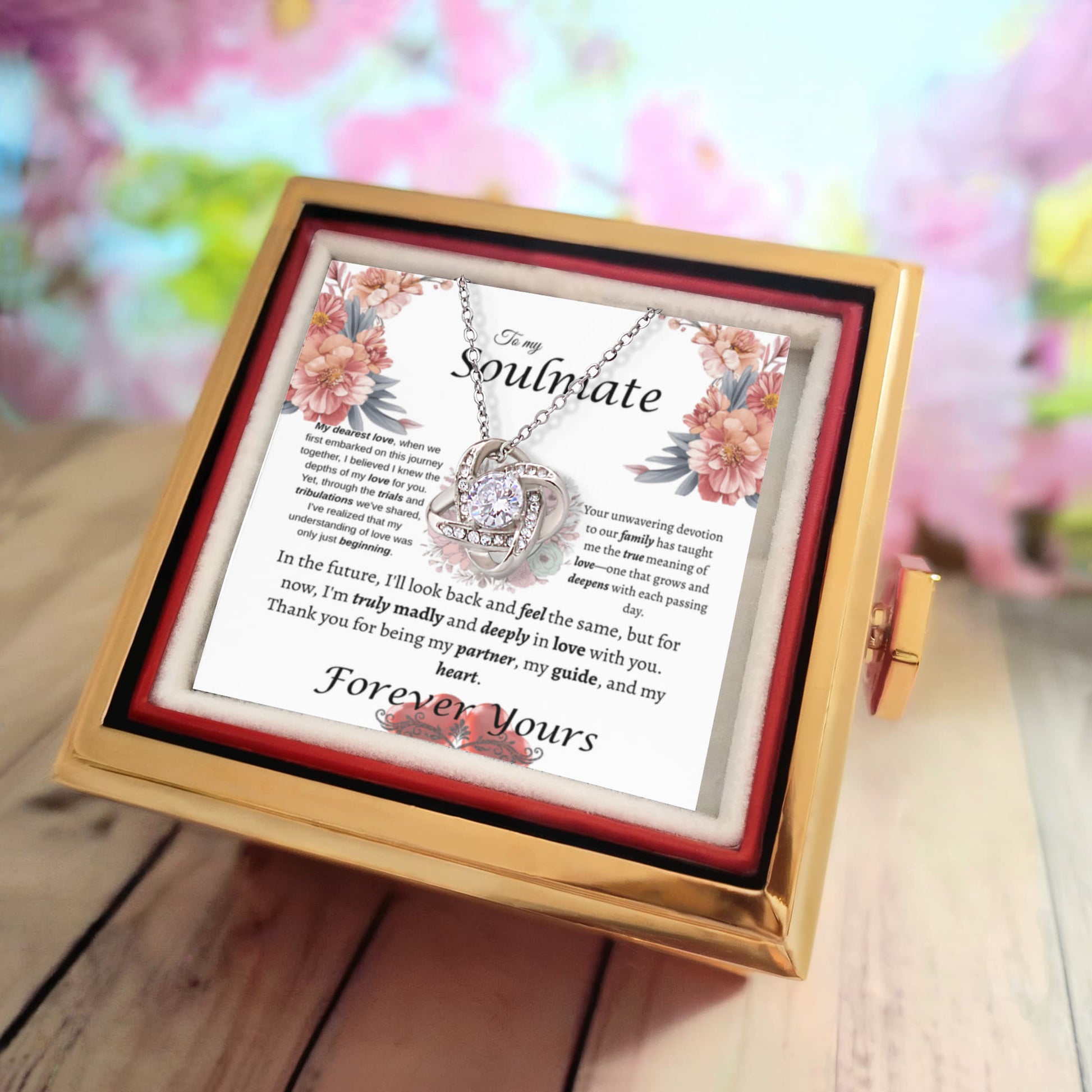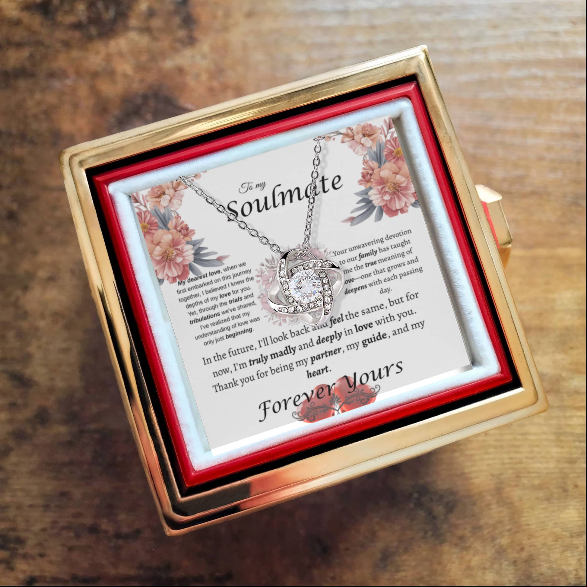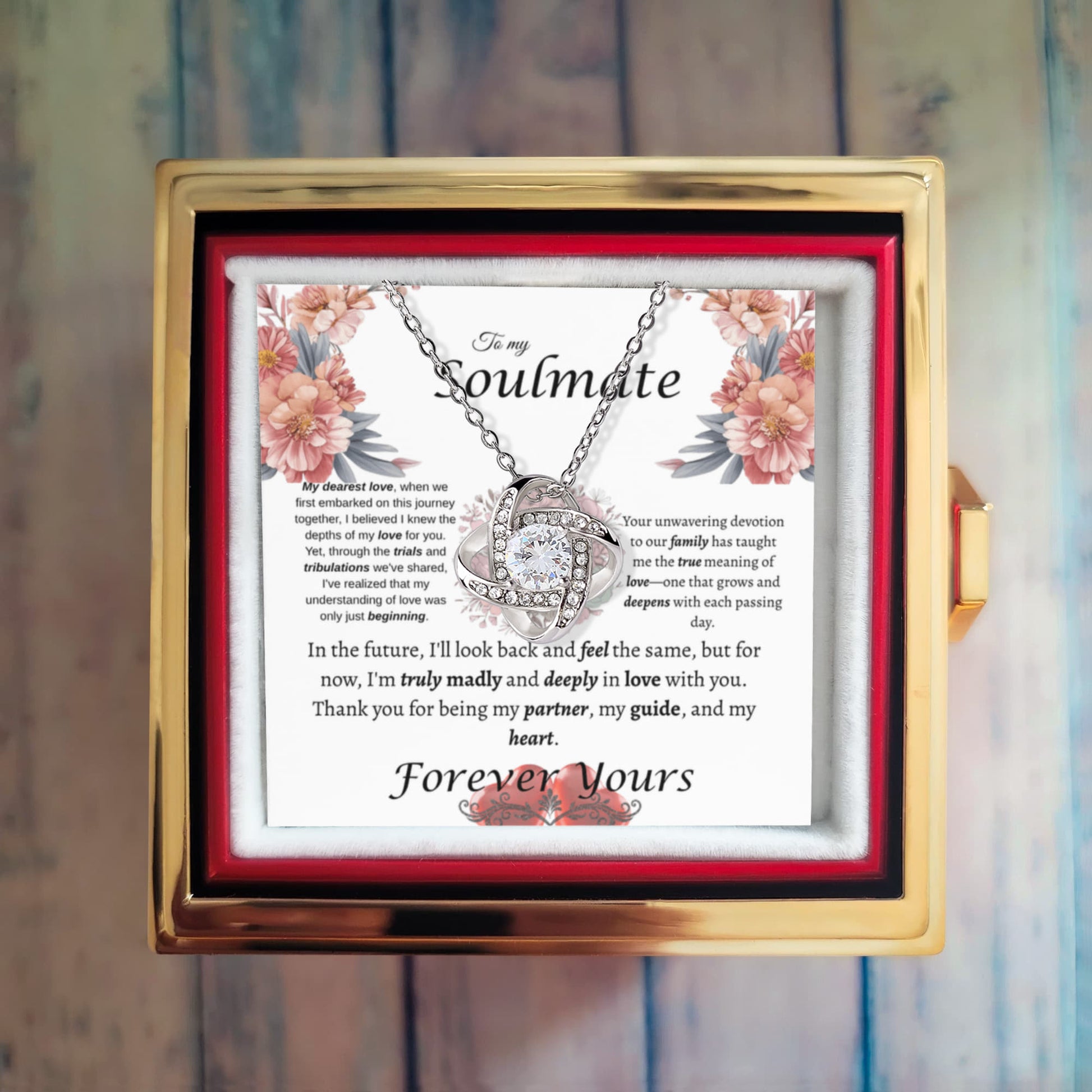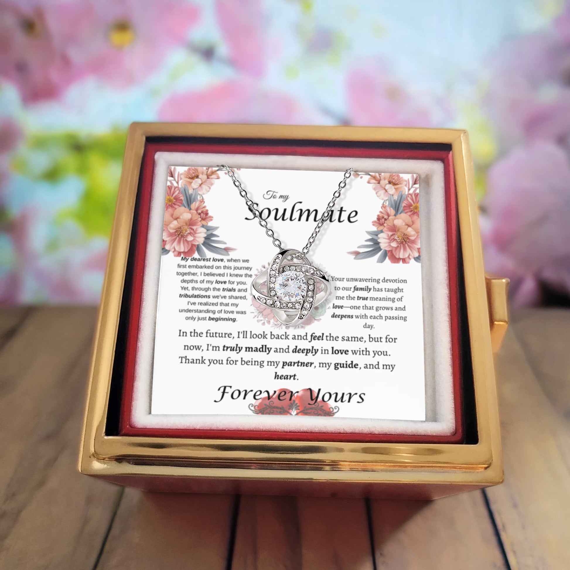 Imagine her reaction as she receives this beautiful Love Knot Necklace. Representing an unbreakable bond between two souls, this stunning pendant is adorned with premium cubic zirconia crystals, making it a timeless symbol of love and devotion. The luxurious box, featuring a meticulously preserved rose that never fades, adds an extra touch of love. With a simple turn of the gold knob, her breathtaking gift is revealed—making it the perfect sentimental gift for that special someone.